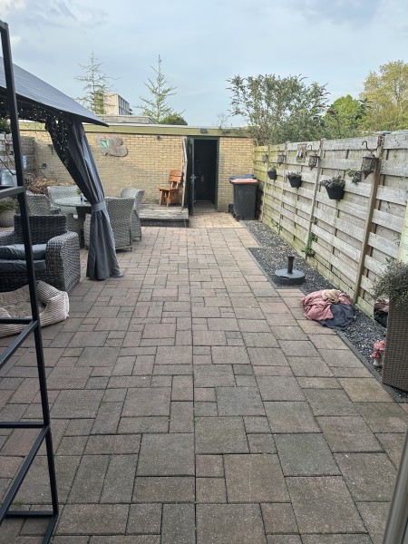 Leuke tussenwoning, woonkamer met open keuken. Grote achtertuin, met schuur aan de achterzijde. 3 slaapkamers en badkamer op de 1e etage. Geen zolder.
