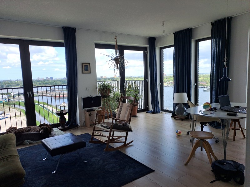 Ruime 3 kamer flat op NW ligt op de 13e verdiepin g op het Zeeburgereiland ten oosten van het centrum van Amsterdam. Woonkamer met open keuken, 2 slaapkamers, hal en inpandige berging. Het hele apartmenet is omzoomd door manshoge glazen deuren die geheel op gedeeltelijk opengezet kunnen worden. Daardoor krijgt de woning de sfeer van een penthouse. Uitzicht aan de noordkant op Schellingwoude, IJmeer en Waterland. Bij helder weer zie je rechts het Muiderslot. Aan de westkant de oostelijke eilanden en in de verte de ADAM woning. Dichterbij de wording van de Sluisbuurt. 's avonds en 's nachts zie je de stad sprookjesachtig verlicht. Centraal station op 15 min met de tram. Parkeervergunning 140,- per half jaar. Leeftijd min 55plus. Wooncorporatie www. de akropolistoren.nl