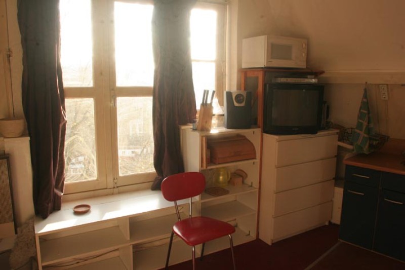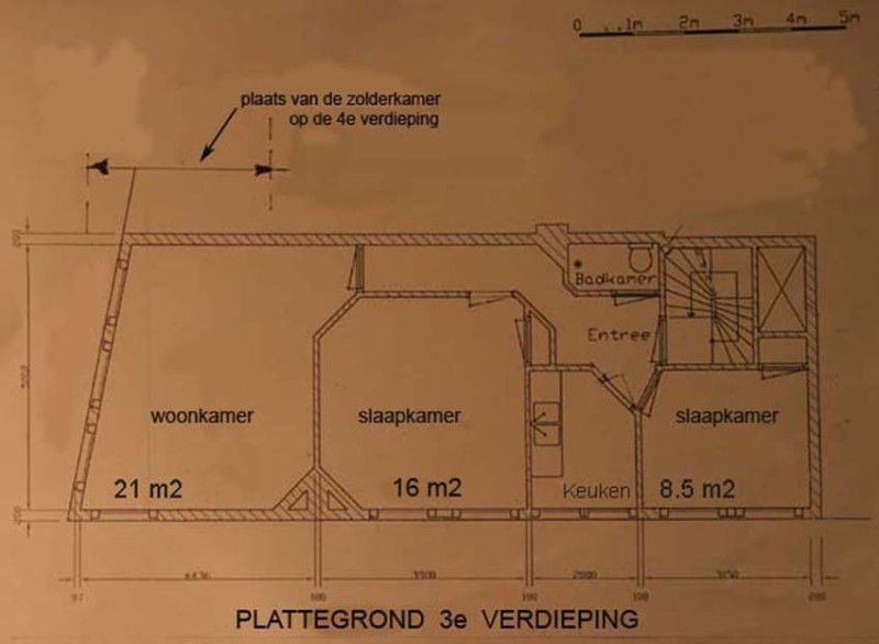 De woning is gelegen in de Nieuwmarktbuurt in Amsterdam en een paar minuten lopen van het Centraal station en de Oosterdok parkeergarage waar je gratis kunt parkeren met de parkeervergunning van deze buurt. De eigenaar is een particulier uit Weesp. Na de 4e foto van de benedenverdieping met open deur naar de entree zie je: Twee oude foto's van de woonkamer. Na de plattegrond van de 3e verdieping zie je 3 vrij recente foto's van de slaapkamer 16 m2. De vierde foto is een recente foto van de slaapkamer van 8,5 m2 Na de plattegrond van de zolderkamer zie je 3 foto's van de zolderkamer.' De laatste is een oude foto van de keuken. De woonkamer van 21 m2 op de plattegrondtekening bestond vroeger uit een slaapkamer van 1.80 breed met één raam en een kamer die d.m.v. een dubbele deur verbonden was met een ruimte: de huidige slaapkamer van 16 m2. Beide kamers 4 m breed.Het dubbele deur kozijn is nog aanwezig, maar dicht getimmerd. De deur naar die slaapkamer van 1.80 breed is de huidige deur naar de woonkamer. Vroegere bewoners hebben die verbouwing gedaan. Dat kan evetueel weer hersteld worden. De huidige slaapkamer van 16 m2 kun je weer bestemmen als woonkamer en groter maken door de gangwand weg te halen. Dat hebben mijn benedenburen gedaan en die hebben dus de slaapkamer aan de voorkant nog. Je kunt dan twee woonkamers en-suite maken of twee slaapkamers aan voorkant. De twee bergruimtes op zolder heb ik verbouwd tot één zolderkamer. Je komt dan met de zolderkamer op vijf kamers. Ik vraag overnamekosten. De woning die ik zoek is een begane grond woning met minimaal 3 kamers en een tuin . De woning die ik zoek moet gesitueerd zijn in of rond steden zoals Amsterdam, Haarlem, Leiden, Den Haag, Delft, Arnhem, Nijmegen, Zwolle, Deventer en Zutphen. Ook is driehoeksruil mogelijk.
