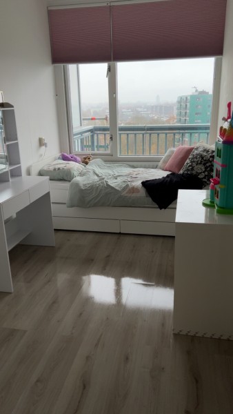 Erg ruim appartement op de 10e verdieping met prachtig uitzicht. 3 slaapkamers, ruime keuken en woonkamer. Bij binnenkomst staat u in de gang, door de deur links is de grote slaapkamer gevestigd en aan de rechterkant de ruime, dichte keuken. Verder komt u uit in de woonkamer waar ook de eettafel staat. De balkondeur bevind zich ook in de woonkamer. Aan de linkerkant in het halletje bevinden zich de badkamer, het aparte toilet, twee inbouwkasten en nog 2 slaapkamers. Voor de kinderen wordt er hard gewerkt aan een nieuwe speeltuin achter de flat!